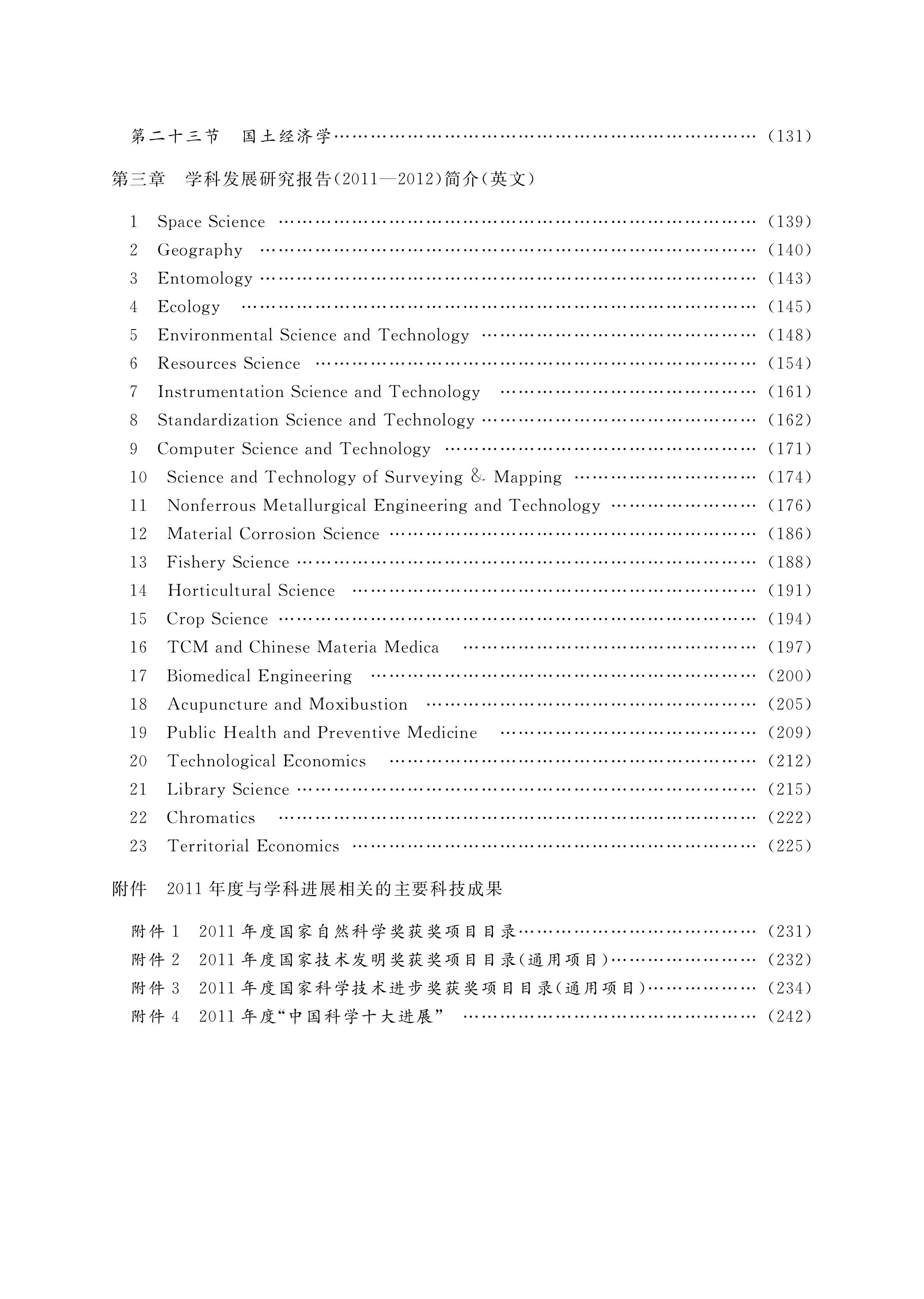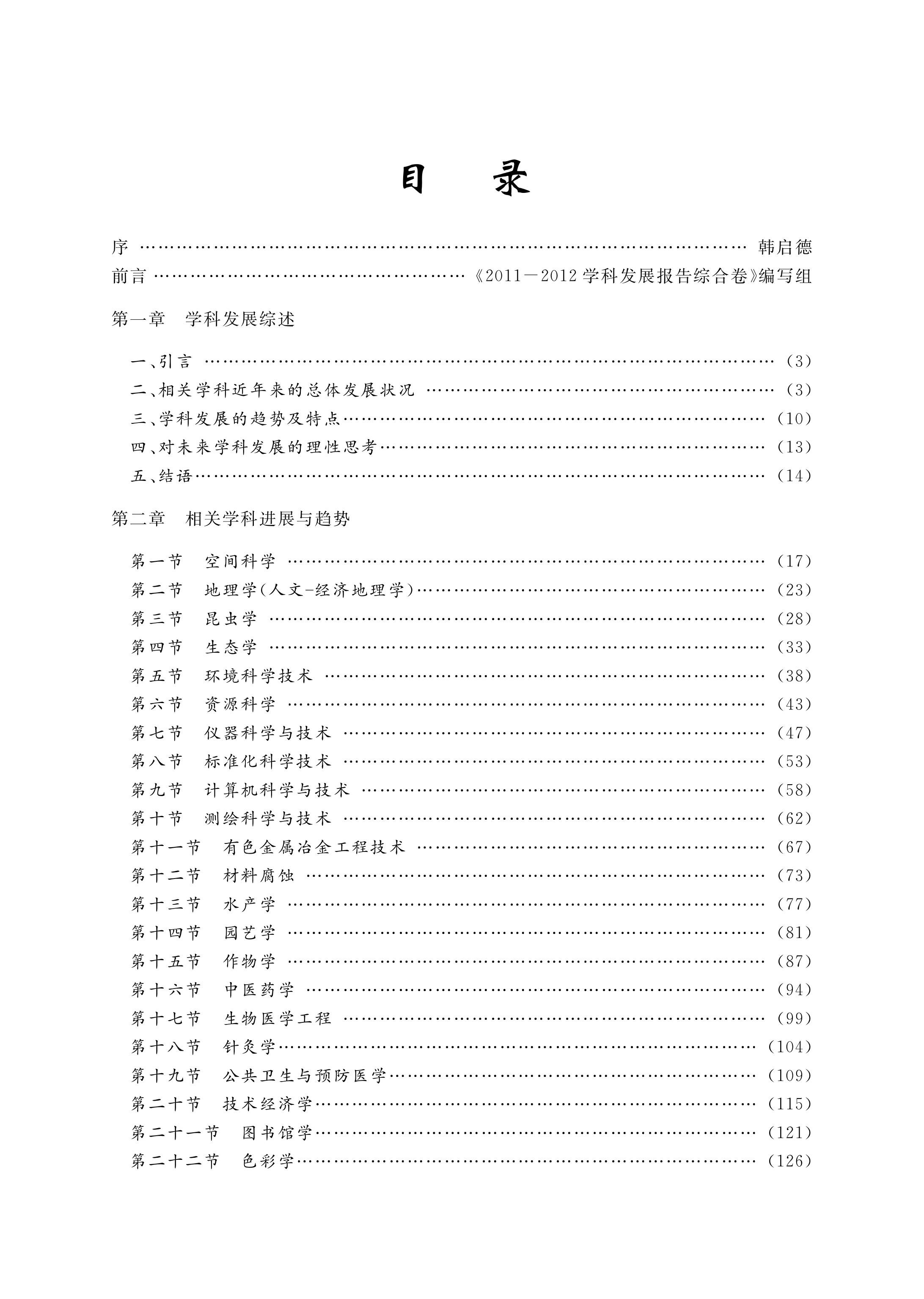 《中国科协学科发展研究系列报告:学科发展报告综合卷(2011-2012)》共分四个部分:第一部分综合分析了2011年度23个学科的发展报告,梳理、总结了各学科的主要进展及共性特点,分析了学科发展总体趋势,对学科未来的发展提出了理性思考;第二部分简要介绍了23个学科发展报告的主要内容,介绍了各学科近年来的研究进展、国内外发展水平比较、各学科的发展方向与对策建议等;第三部分为23个学科发展报告主要内容的英文介绍;第四部分为我国2011年度与学科进展有关的主要科技成果资料的介绍。